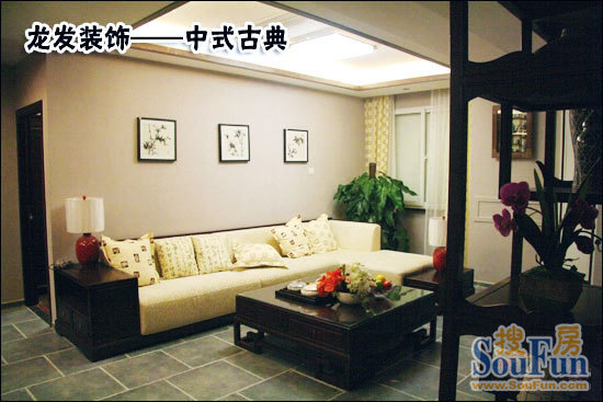 装饰元素似乎在每一种风格中都是必不可少的,他们代表了主人的喜好和品位。龙发的这套装饰也不例外,设计师在电视柜上摆放了各种各样很有中国特色的饰品,两侧还有兰花,是中国很有代表的植物,在沙发的背景墙上还有中国传统的相框或字画。 3.隔断的应用