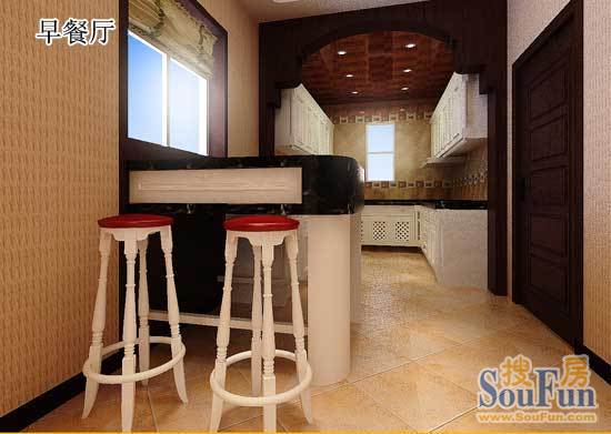 早餐厅与餐厅相连,这里选用淡粉为主色调,颇有些乡村风格。窗台下的吧台设计使得空间更休闲自由,很适合年轻人的品味。早上拉开窗帘在第一缕阳光的照射下,甜蜜的享用爱人亲手做的早餐,这是一幅多么温馨惬意的画面呀。 6、厨房