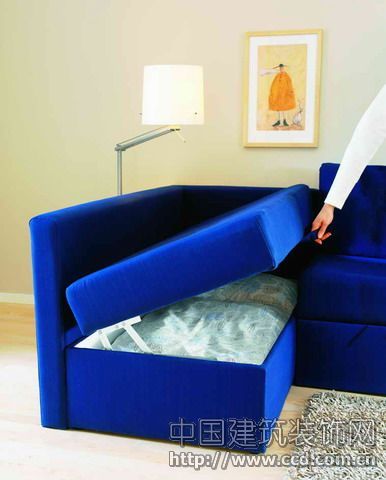 沙发不仅可以变成床,也可以“变身”成储藏箱,帮助主人存放平时不用的被单、衣物。只需要提一下手拉带,沙发的内部空间就可以展露眼前。