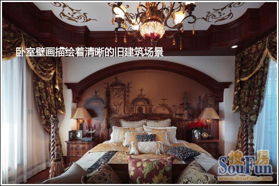 卧室大床背景墙又见油画,不过这里描绘着清晰的旧建筑的线条,有教堂,有古建筑高耸的圆顶以及旧时期人们生活的场景,非常别致又奢华。