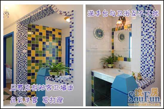 原本洗手台与淋浴间是一体,但是设计师为了使主人使用起来更加方便,在中间用墙壁隔断,使洗手台单独成为一个功能分区,并且在洗手台与过道之间建了一道矮墙,表面饰以马赛克。这样的话,外间的洗手台与里间马桶,淋浴设施互不干扰,避免了尴尬。